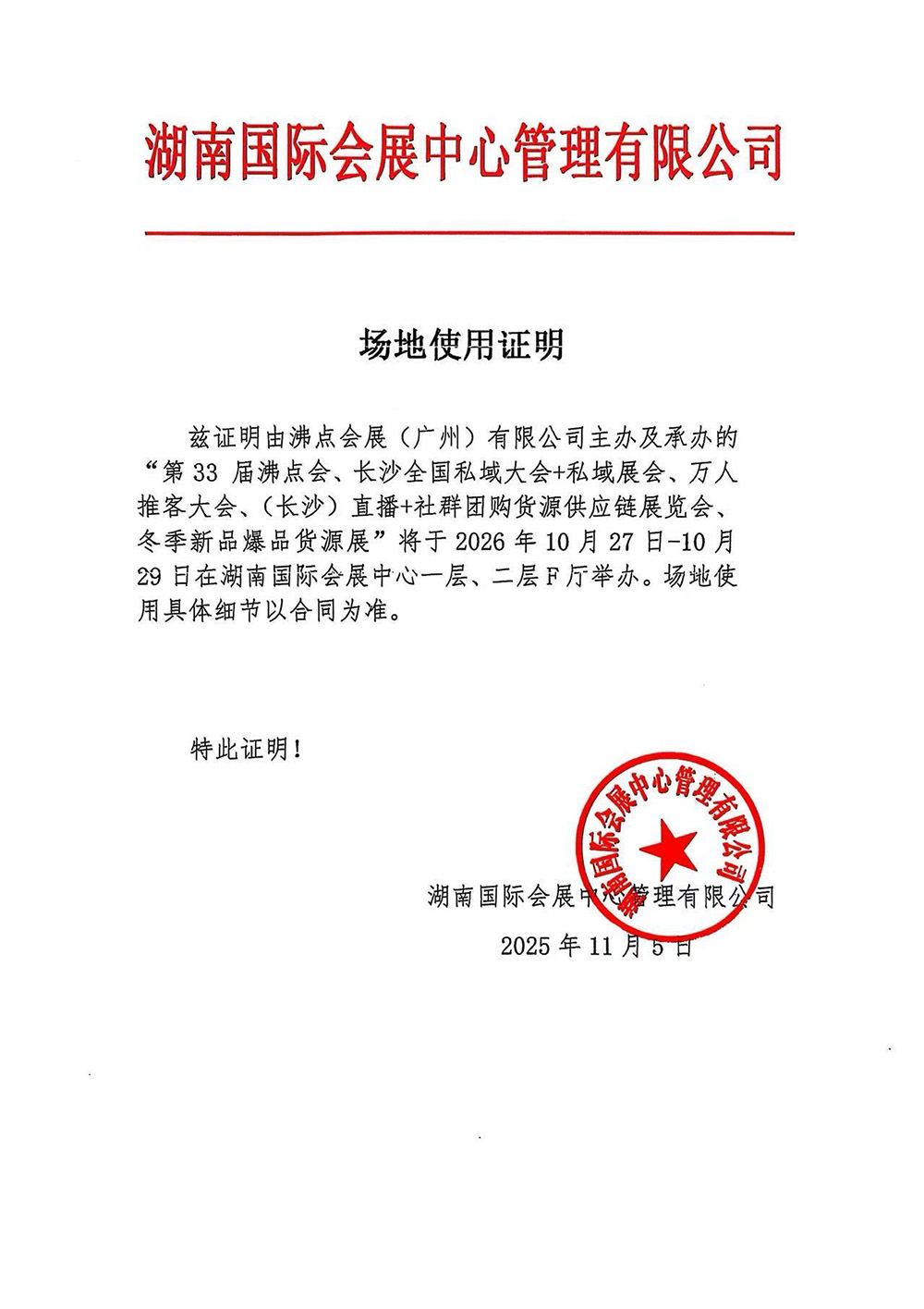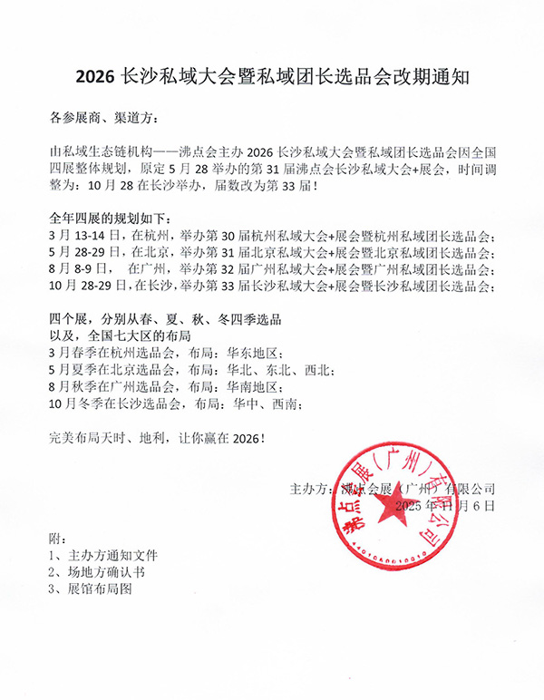 由私域生態(tài)鏈機構(gòu)——沸點會主辦2026長沙私域大會暨私域團長選品會因全國四展整體規(guī)劃,原定5月28舉辦的第31屆沸點會長沙私域大會+展會,時間調(diào)整為:10月28在長沙舉辦,屆數(shù)改為第33屆!